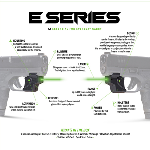 Viridian's E SERIES laser sight is specifically designed for the everyday conceal and carry owner. This model specific, trigger guard mounted, laser sight offers the most powerful laser legally available, delivering rapid target acquisition when you need it most.