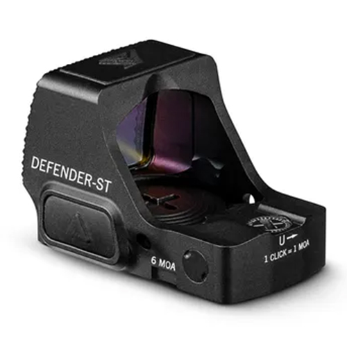 The Defender-ST™ features a total of 10 brightness settings (eight for daylight use and two for night vision). Offered with either a 3 or 6 MOA daylight bright red dot, it is easy to see and acquire targets regardless of lighting conditions or background.