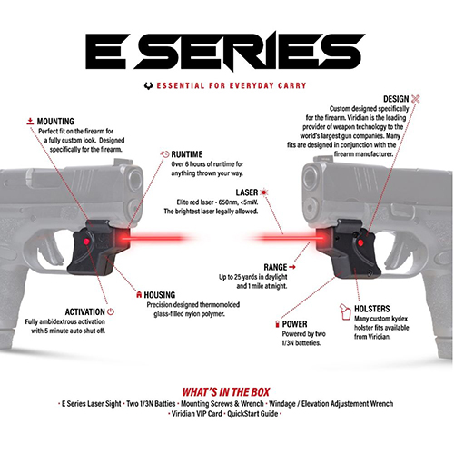 Viridian's E SERIES laser sight is specifically designed for the everyday conceal and carry owner. This model specific, trigger guard mounted, laser sight offers the most powerful red laser legally available, delivering rapid target acquisition when you need it most.